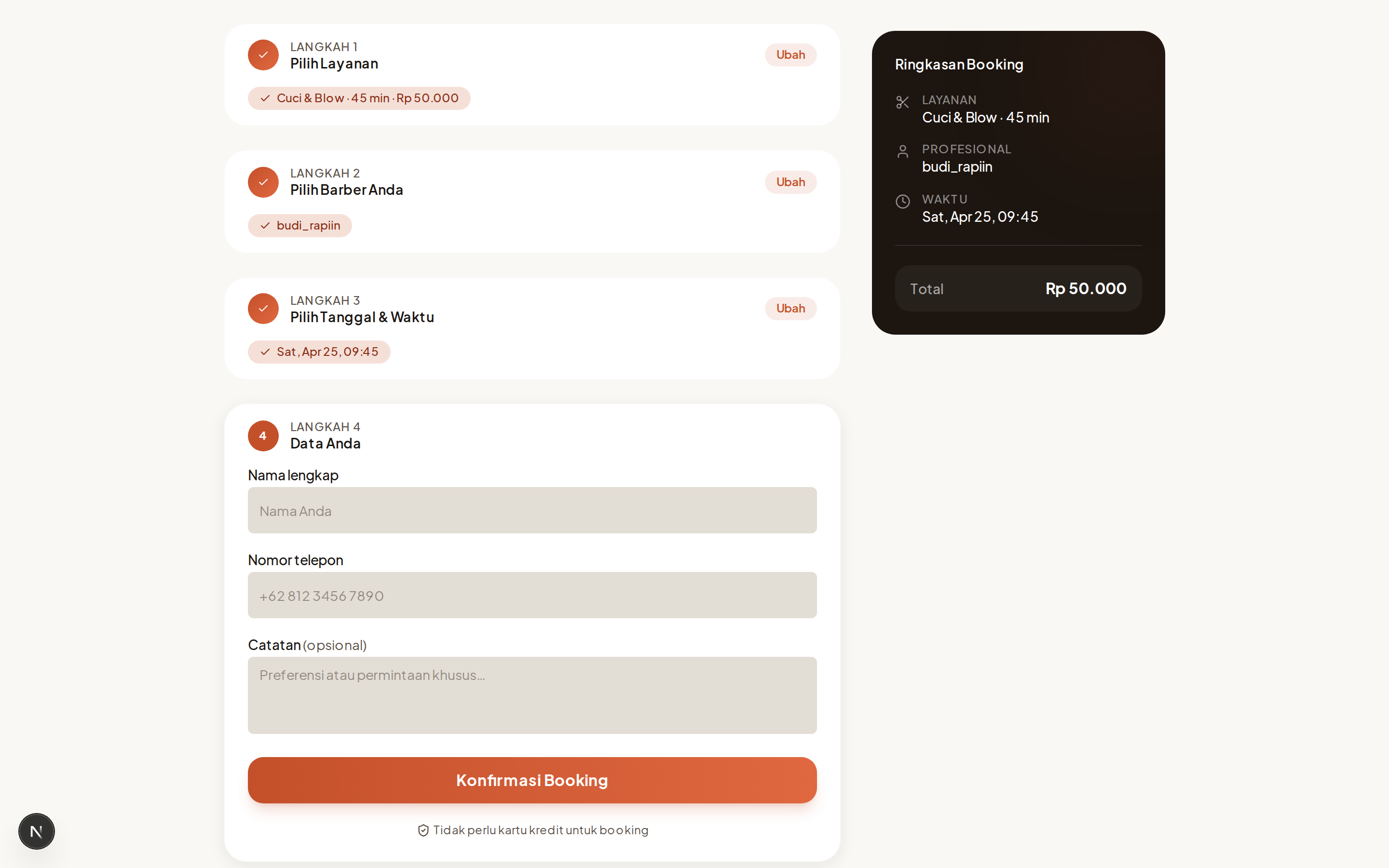 Tidak ada akun yang perlu dibuat. Booking cukup dengan nama dan nomor telepon.