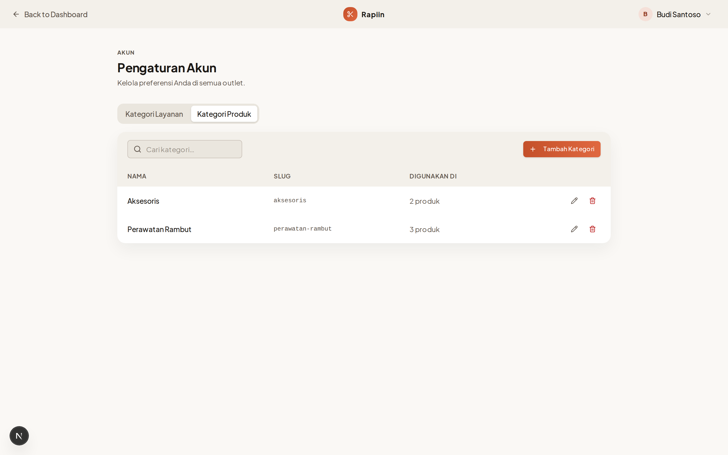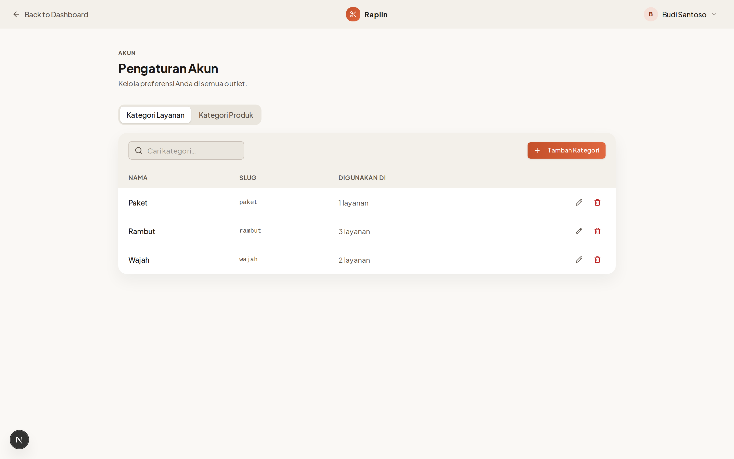 Pengaturan Akun berisi kategori global yang digunakan di semua outlet Anda. Kategori ini muncul sebagai pilihan saat menambahkan layanan atau produk baru.