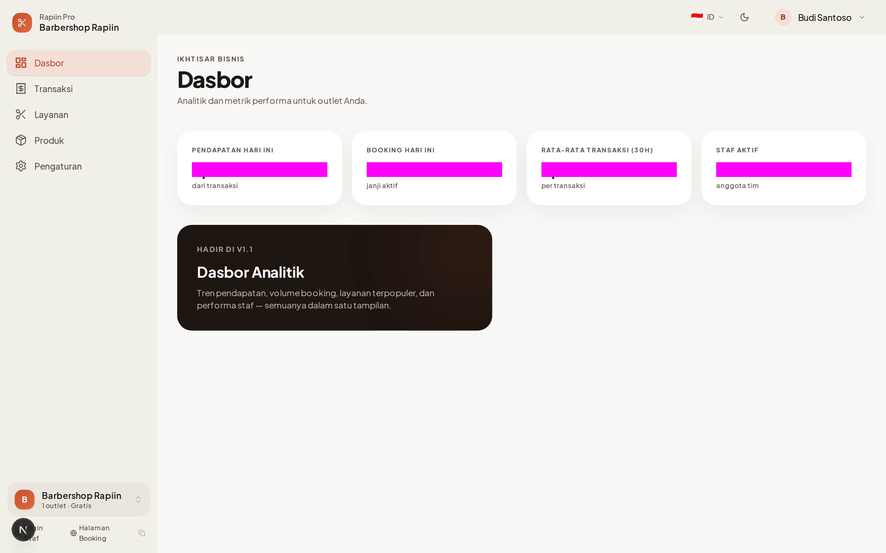 Dashboard memberikan gambaran performa bisnis Anda hari ini secara real-time — pendapatan, jumlah booking, rata-rata nilai transaksi, dan jumlah staff aktif.