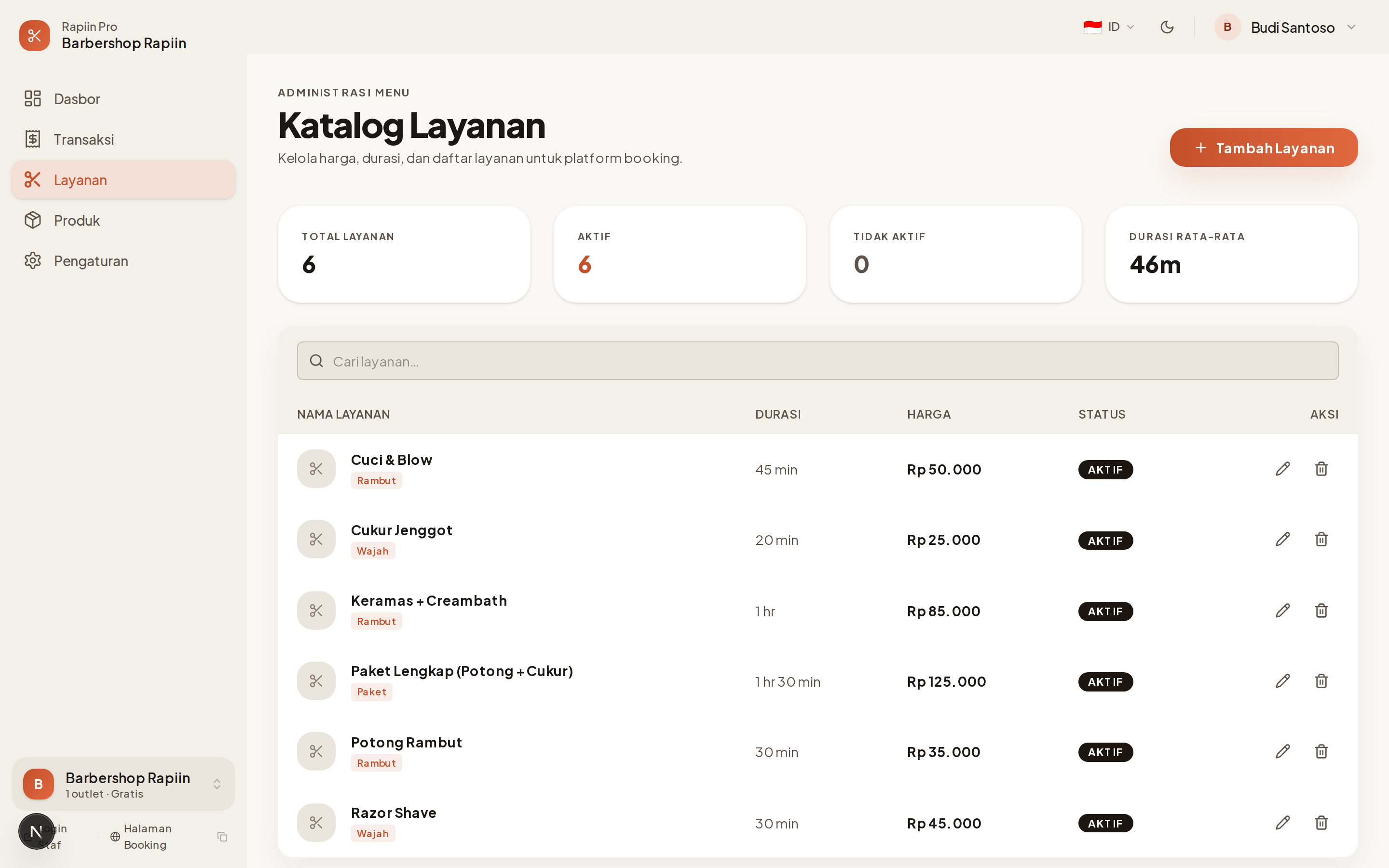 Halaman Layanan memungkinkan Anda mengelola semua layanan yang ditawarkan outlet — dari potong rambut hingga perawatan wajah. Setiap layanan memiliki nama, durasi, harga, dan kategori.