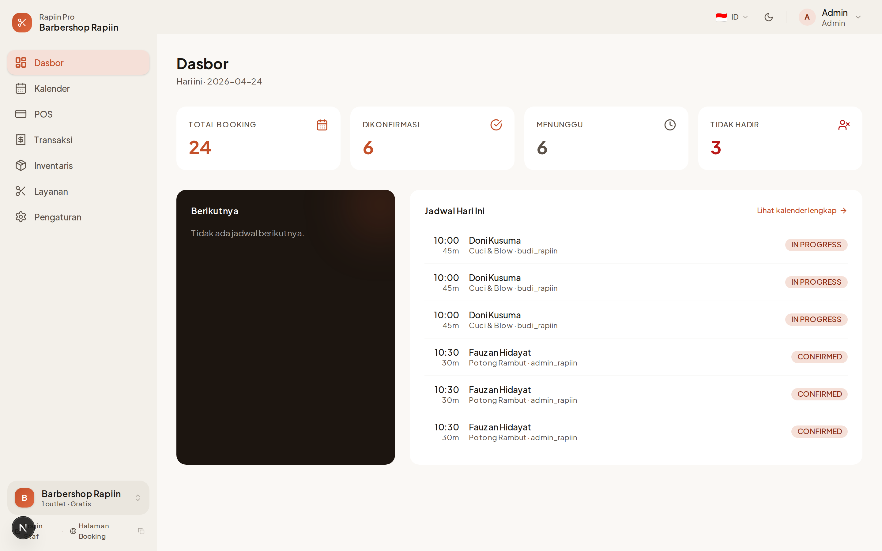 | Admin | Dashboard, Kalender, POS, Transaksi, Inventori, Layanan, Pengaturan |